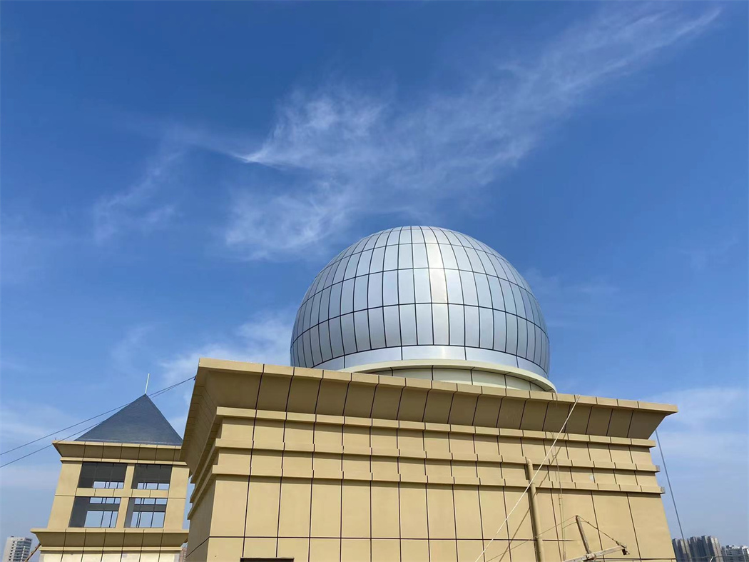 淮北中學(xué)天文臺(tái),在樓頂搭建一座2.5米高房子,雙層結(jié)構(gòu),外板采用鋁塑板,內(nèi)板采用微孔鋁板,中間有吸音棉,一樓鋪設(shè)地磚,二樓鋼結(jié)構(gòu),鋼平臺(tái)大梁小梁采用矩形管,定制望遠(yuǎn)鏡基座,用于后期放置望遠(yuǎn)鏡用,制作順墻弧形鋼梯,扶手采用市場(chǎng)專用扶手,美觀、牢固。上層配備9米經(jīng)典式天文圓頂,外殼光滑,具備抗腐蝕,防銹,密封防塵好,不漏雨,也是天文觀測(cè)的標(biāo)志性建筑,經(jīng)典型天文圓頂古典美麗,是大眾認(rèn)知度很高的一種天文建筑。