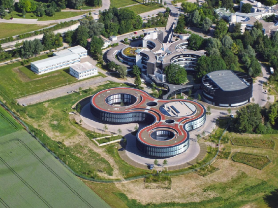 鳥瞰已搬到德國加興(Garching)的歐南臺總部,下方的紅色頂建筑和其上方的灰褐色頂建筑為總部主樓,右側(cè)黑色圓形建筑為技術(shù)部建筑。左側(cè)方形建筑則是集裝箱搭建的臨時建筑,此前的自適應(yīng)光學(xué)部就占據(jù)此小樓。